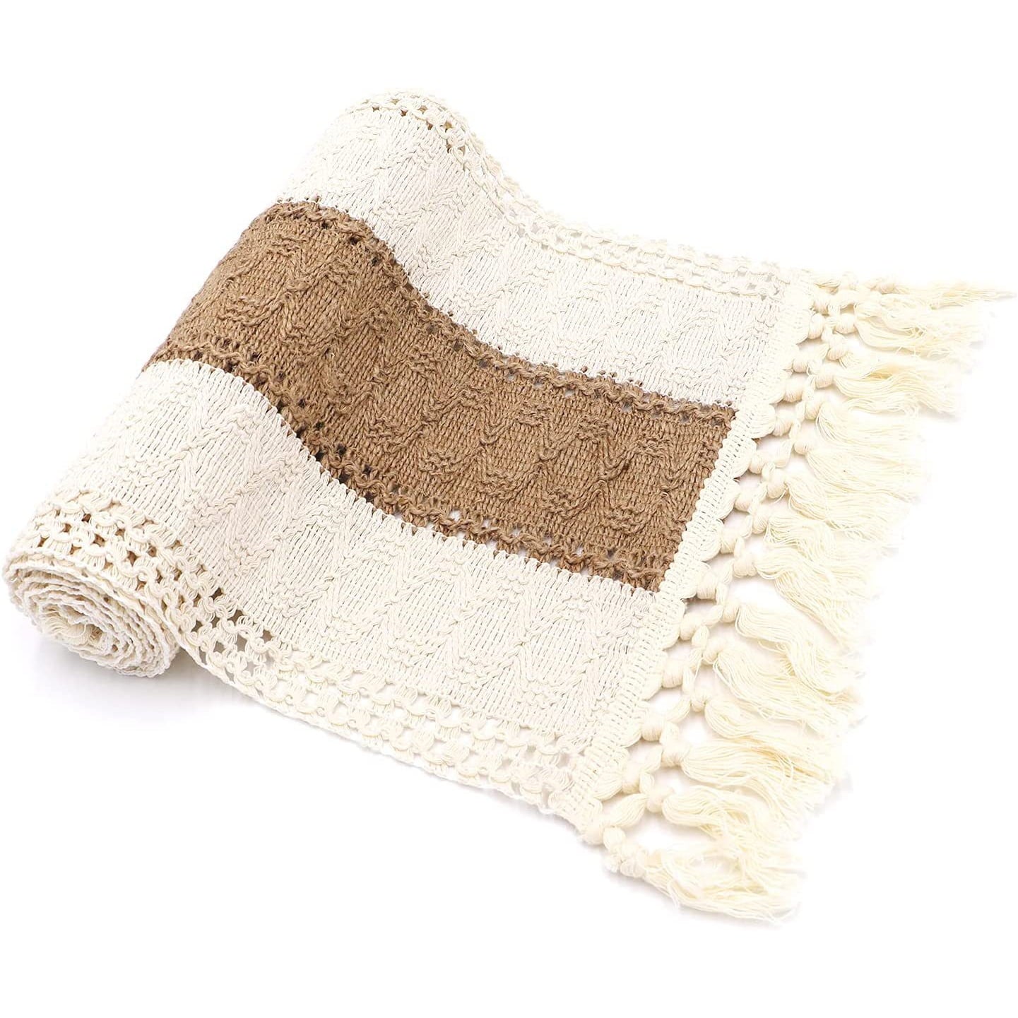 TETOU Linen Tassel Table Runner 72 Inches Long Farmhouse Rustic Table Runner Cream & Brown Macrame Table Runner with Tassels for Wedding Afternoon Tea Party